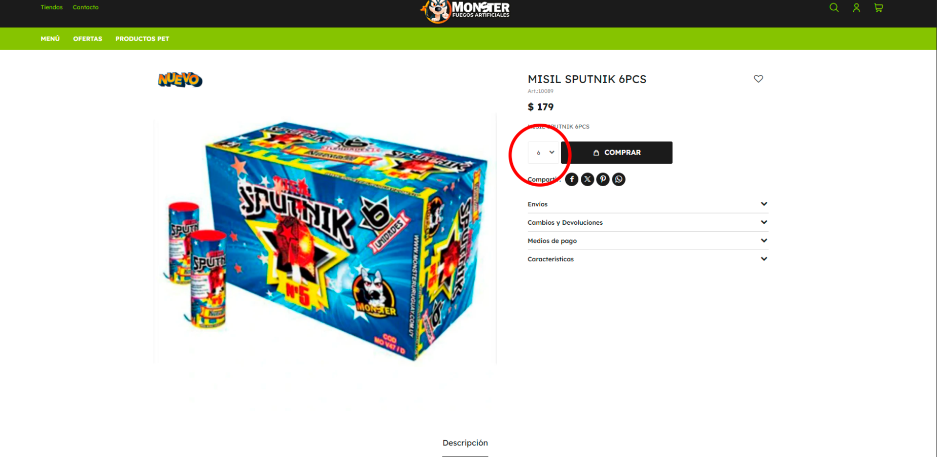 3- En la ficha del producto podrá seleccionar la cantidad de unidades a comprar, y en el caso que el artículo lo permita tendrá que elegir sus especificaciones.